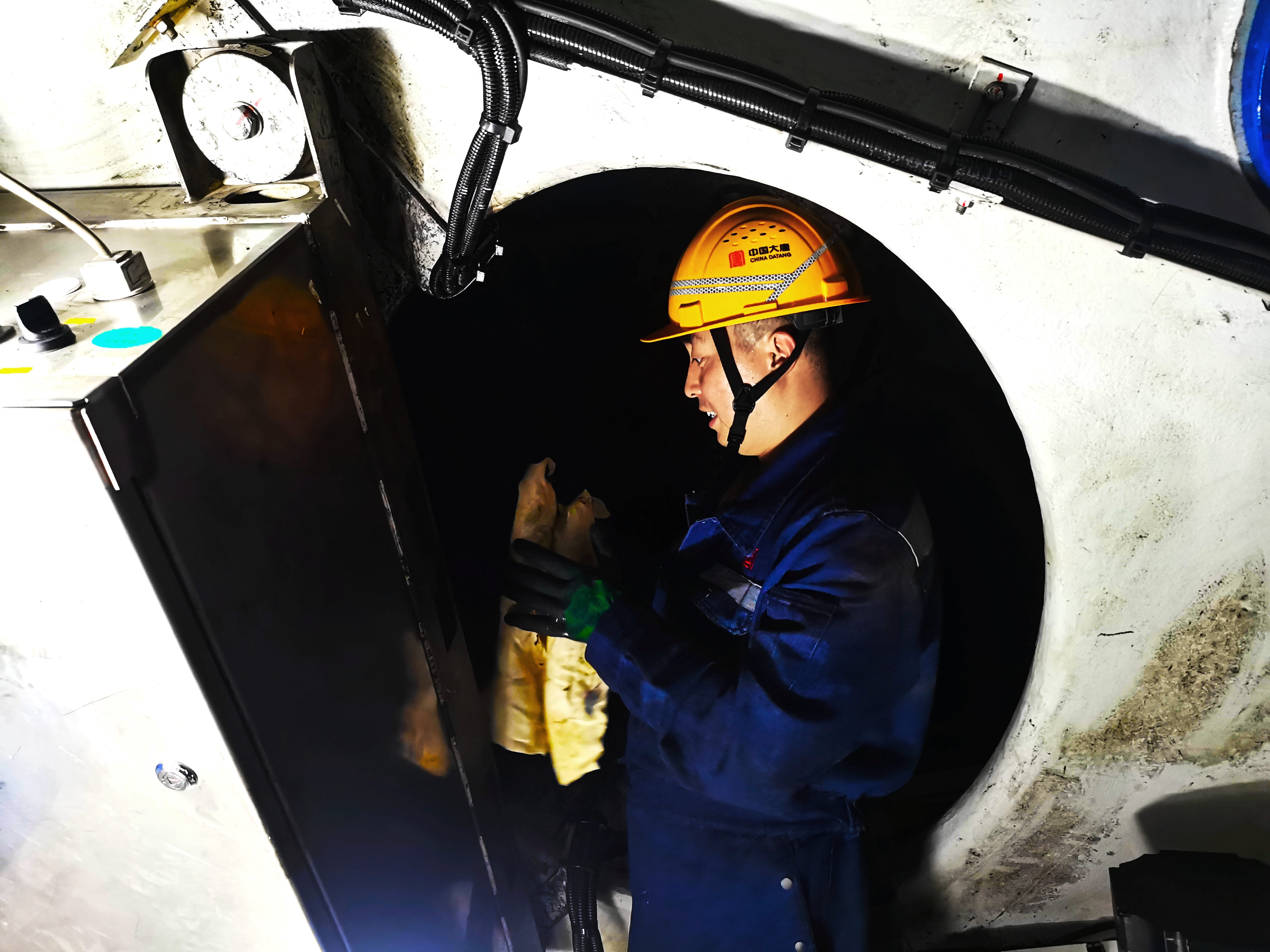 張世杰和靳博杰爬上風機,鉆進狹小的輪轂中,開始排查故障點,刺骨的寒風透過厚厚的連體服直達骨髓。他們的手都被凍得通紅,關節僵硬,搓搓手、哈口氣后,又投入到故障排查中。