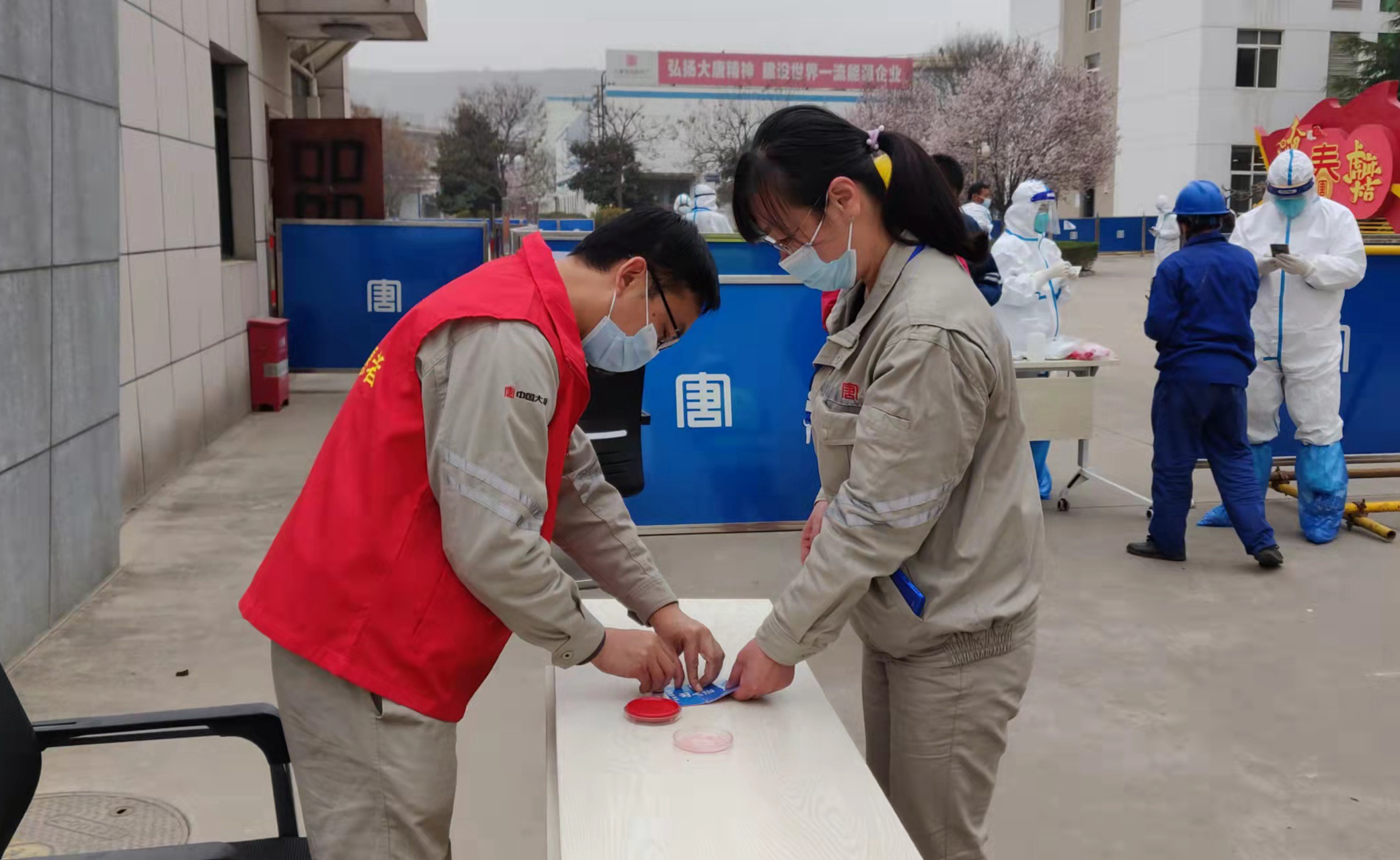 該廠各黨、團支部分別成立黨員消殺隊、青年突擊隊,對全廠所有會議室、辦公室、班組、值班場所、宿舍樓等分片包干、消毒殺菌;9個支部書記、35名黨員志愿者主動請纓,承攬了核酸檢測及分桌就餐期間的現場引導及廠區隔離人員送餐送水工作等,以實際行動在抗擊疫情中擦亮“大唐紅?無限能”黨建品牌。